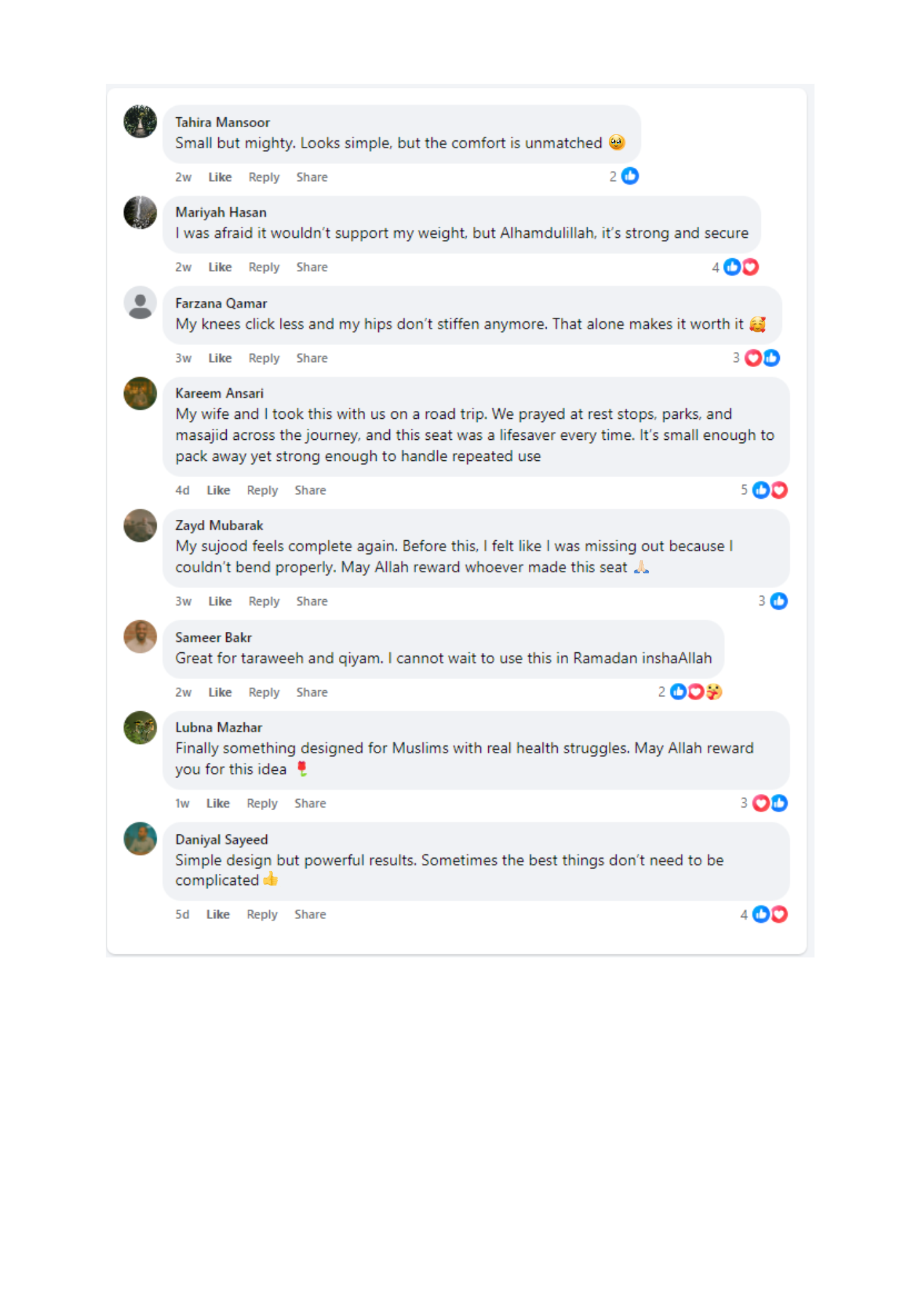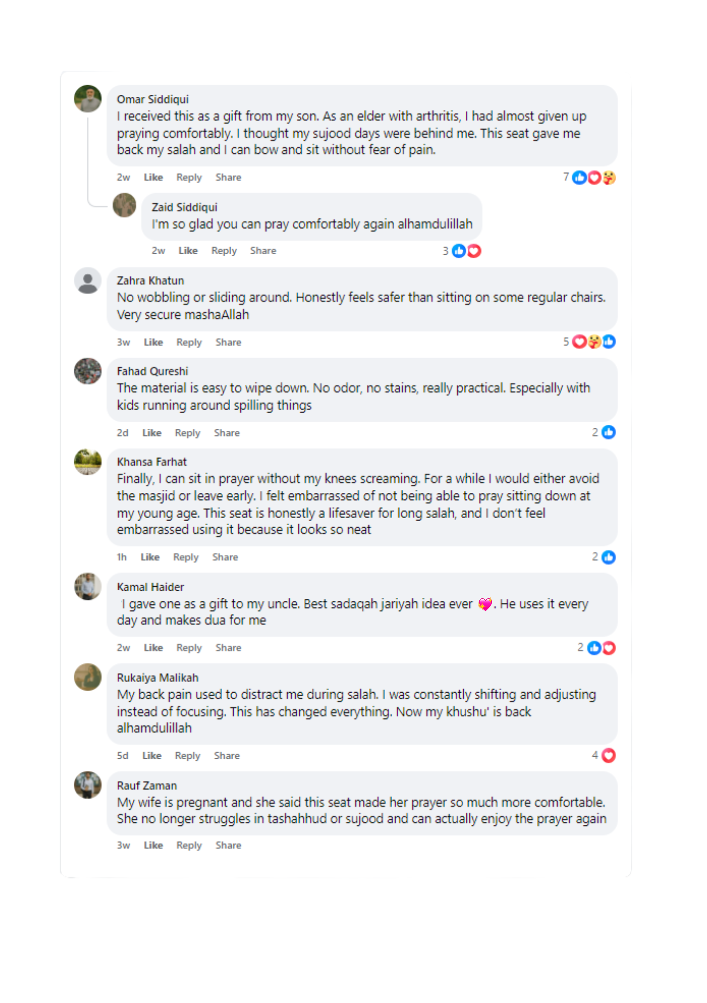 Approved by scholars and rooted in authentic hadith, SalahSeat™ follows Islamic rulings for those unable to pray standing or prostrating due to hardship.