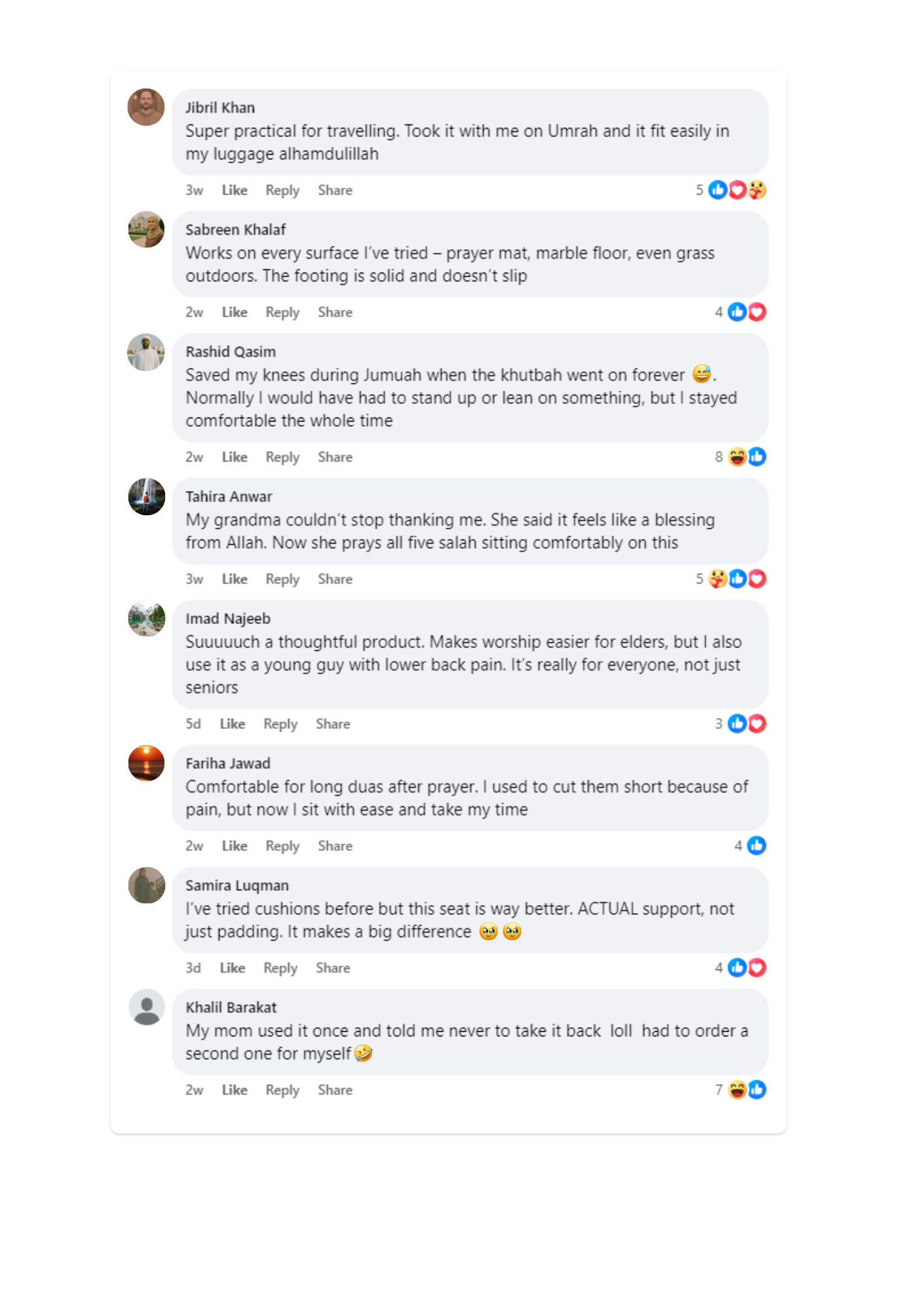 No more knee pressure. No more aching back. SalahSeat™ is designed to relieve tension on your joints, knees, and lower back — so you can focus on your connection with Allah, not your discomfort. ✓ Loved by seniors, post-surgery patients, and anyone with joint pain.